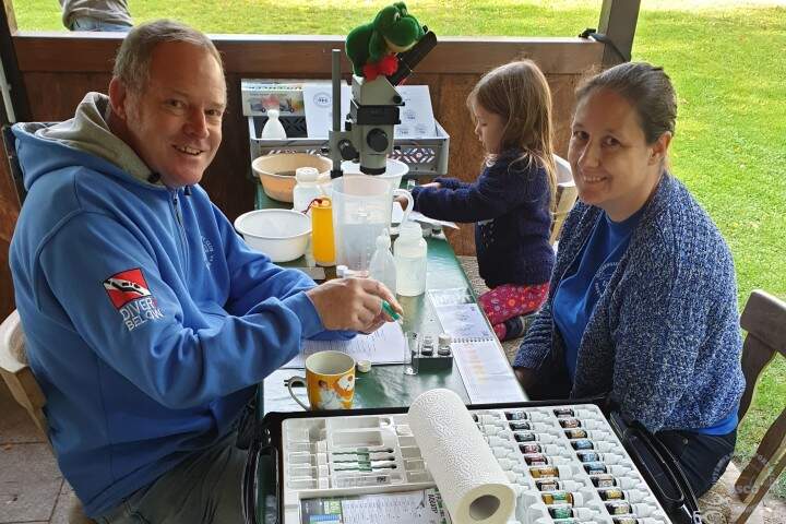Bilder-GalerieWährend Ulrich und KH als Taucherteam unter Wasser Pflanzenproben sammelten und sich einen allgemeinen Eindruck vom Zustand des Gewässers machten, waren Karin und Frank mit dem Wasserlabor auf der Suche nach Anionen und Kationen, von denen sie aber erfreulicherweise nicht viele fanden.