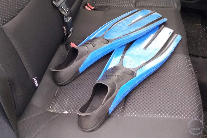 Ich persönlich habe meine Flossen bis heute nicht aus dem Auto ausgeladen, wie ihr auf meinem Foto seht; aus Trotz gegen Corona.